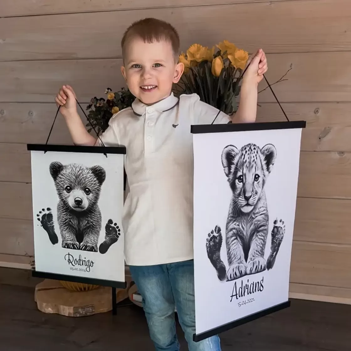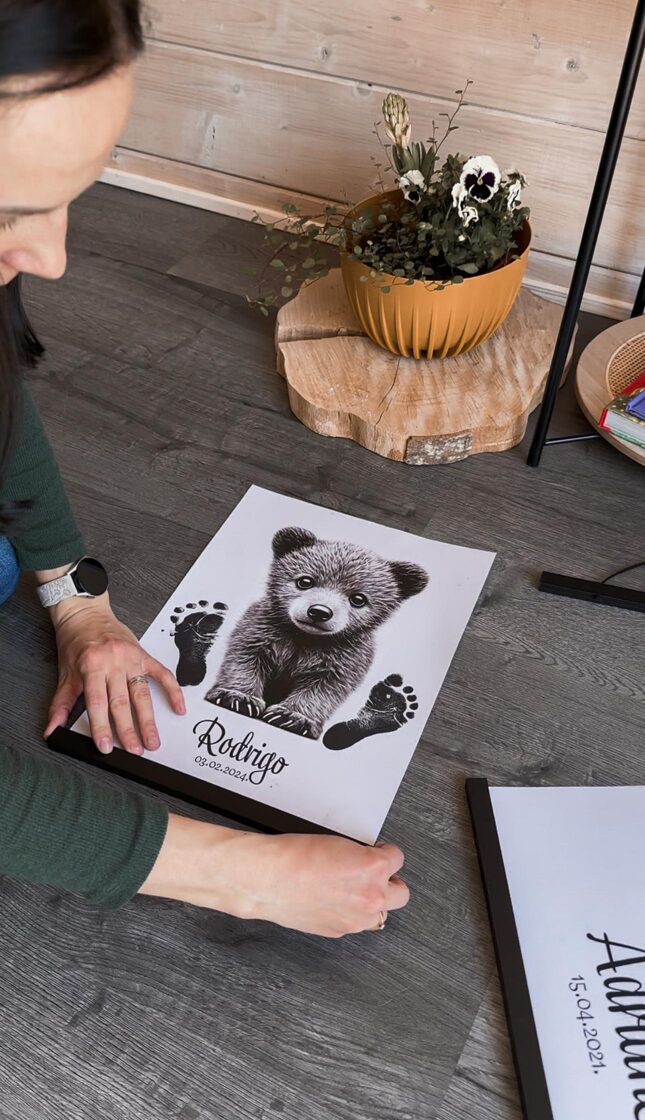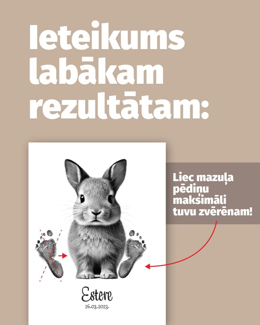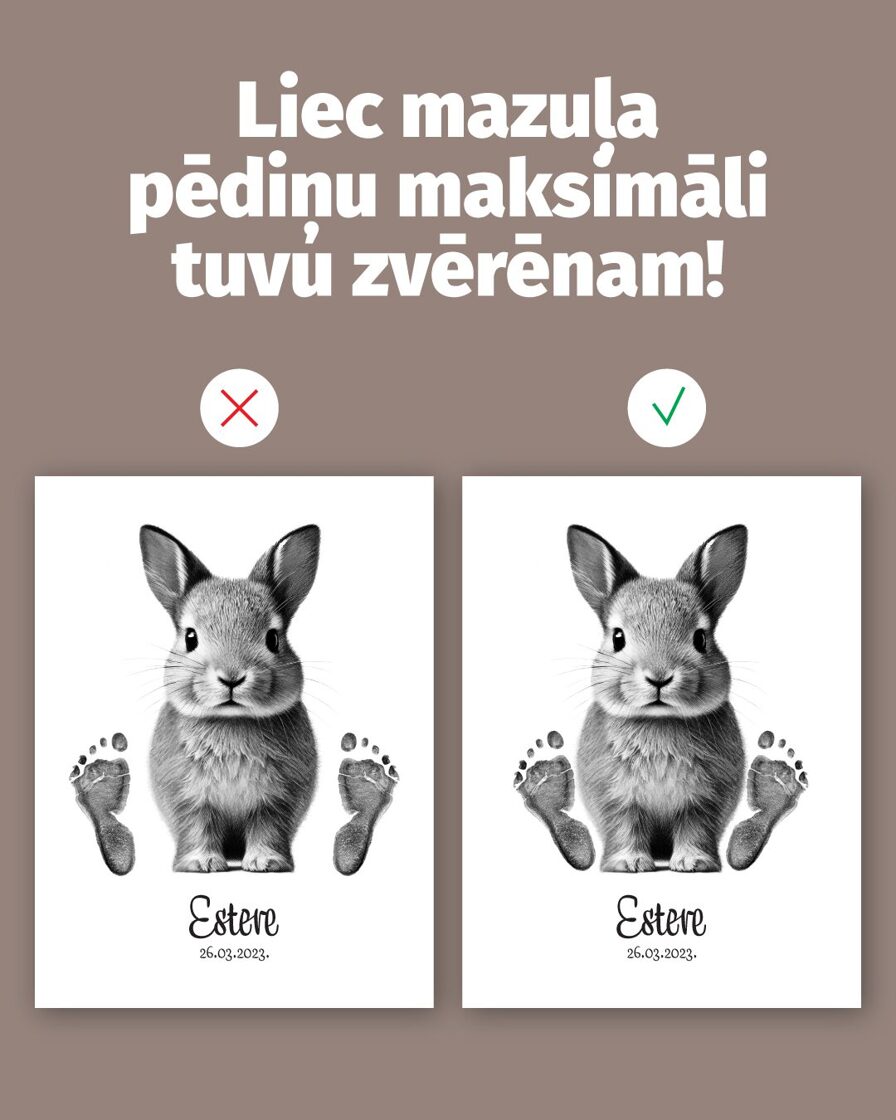 - Dėk mažylio pėdutę ant plakato tiesiai šalia gyvūnėlio ir lengvai prispausk pėdą iš viršaus.